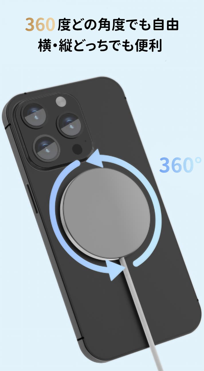 360度どの角度でも自由に使えるため、どの位置に置いても完璧にフィットし、安定した充電を実現。仕事中でも、寝ながらでも、どんな角度でも快適に充電できます。