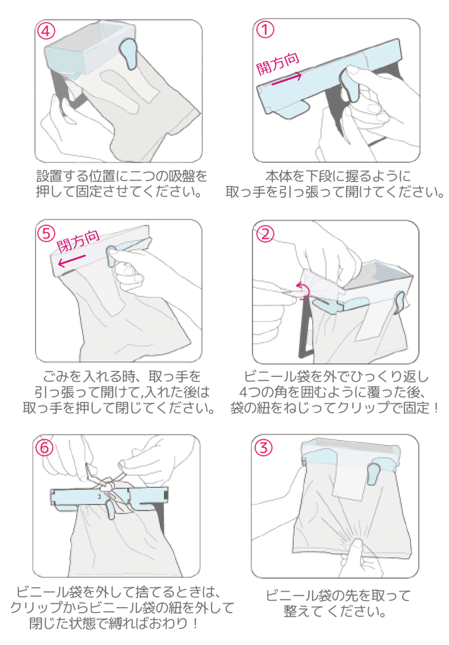 ごみ袋のひもをクリップから抜いて、上のほうにバンザイの状態にして置いて縛ればOKです。ワイズホルダーを使うと悪臭を⼼配せずに、閉じた状態でゴミ袋を縛ることができます。 また⽣ゴミが⼿につく⼼配もありません。