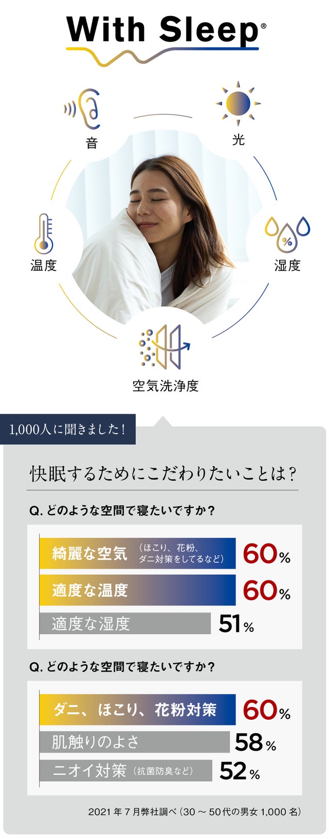 With Sleep®は、寝室の空気清浄環境を改善することで、より快適な睡眠環境を皆さまにお届けします。