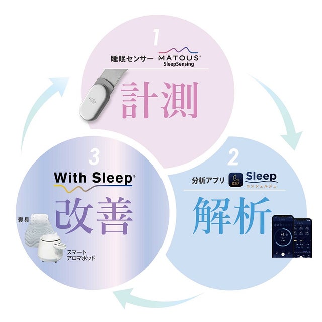 帝人フロンティアが目指す快眠サポートは、睡眠を「計測」し、そこから自分の睡眠の傾向を「解析」、寝室アイテムで睡眠環境を「改善」するという循環を3つのサイクルで睡眠ソリューションを提案します。