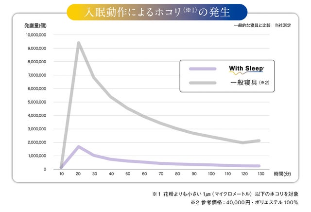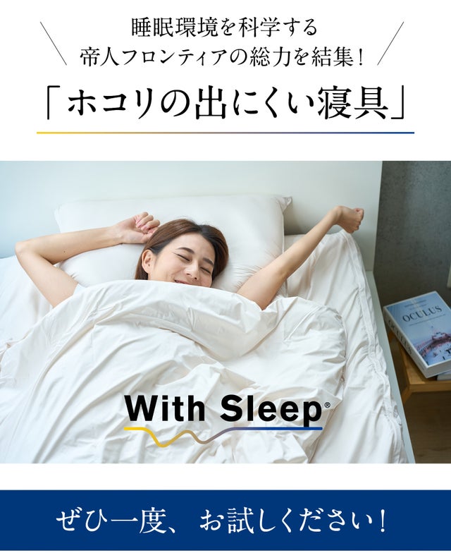 帝人フロンティアの独自技術で実現したWith Sleep®は、品質調査の結果、入眠初期の寝具から発生するホコリの量を約10分の1(弊社従来品と比較)にまで抑えることに成功しました。