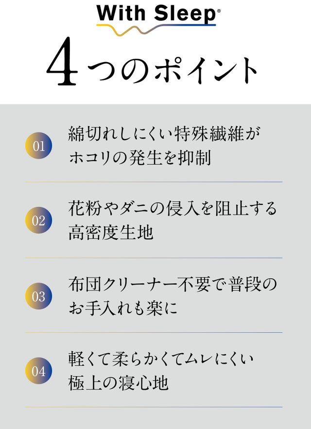 ホコリの出にくさだけでなく、With Sleep®には「軽さ」「暖かさ」「透湿性」といった、お布団に必要な「快適機能」も充実しています。