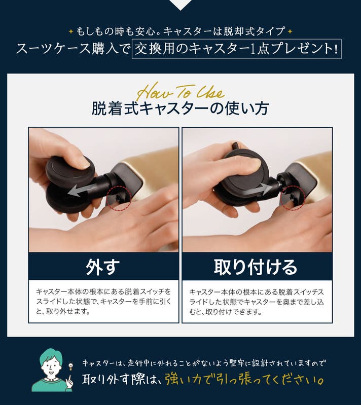 LLサイズの日本製スーツケース ウィズラグ『WizLug』に交換用のキャスターが1点付属するスペシャルセットです。