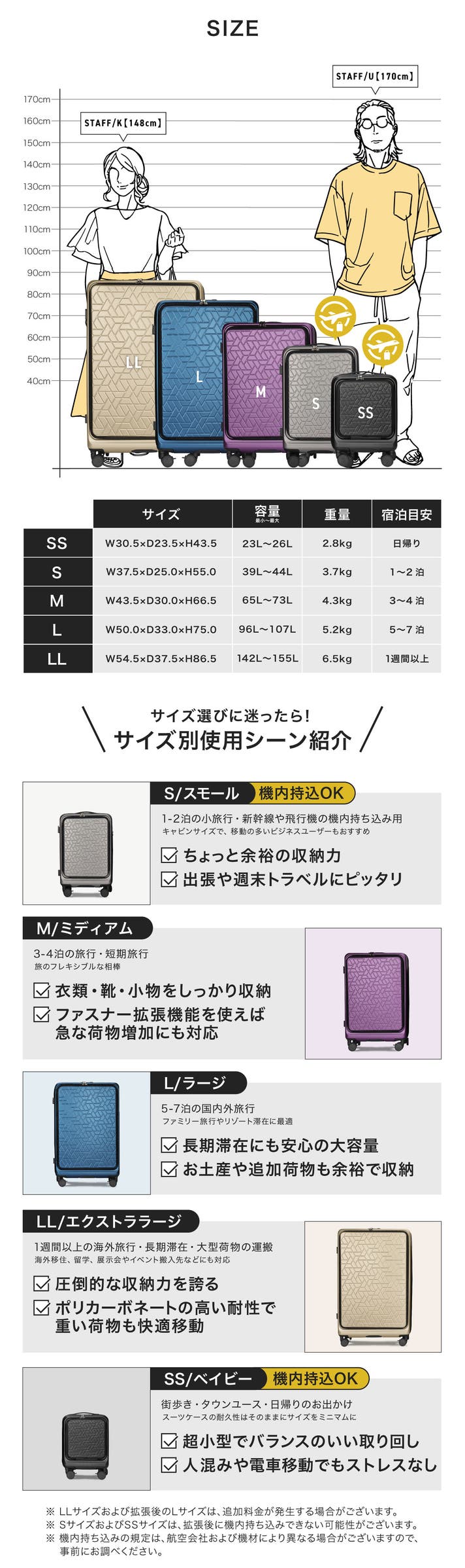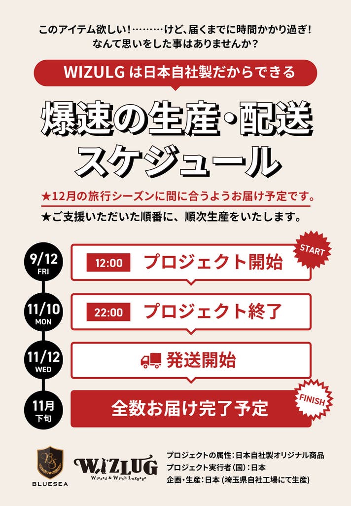 ・機内持ち込みおよび預け入れの規定サイズは、航空会社や搭乗する路線によって異なります。事前にご利用される航空会社の公式サイトにてご確認くださいませ。 ※SサイズおよびSSサイズは、拡張後に機内持ち込みできない場合がございます。 ※LLサイズおよび拡張後のLサイズは、サイズ超過料金が発生する場合がございます。 ・SS(ベイビー)サイズには本体の面積と構造上、一部機能(背面アンブレラスロット/側面サイドグライド/サイドハンドル)は付随しておりません。 ・ご覧になっているモニター環境により実際の商品と色合いが若干異なる場合がございます。予めご了承くださいませ。 ・キャリーバーを使用する際には、皮膚や指などが巻き込まれないように注意をしてください。 【配送遅延とキャンセルについて】 本文中に記載させていただいたスケジュールは、あくまでプロジェクト公開時点の予定です。応援購入の性質上、配送遅延のおそれがございます。原則として、配送遅延に伴う応援購入のキャンセルはできませんが、リターン配送予定月から1ヶ月を超えた場合には、希望者に限りキャンセルにて対応させていただきます。 【商品等の不具合による返品・交換】 原則として、サポーター都合によるキャンセル・返金は承っておりません。 (サポーター都合のキャンセル不可の例:サイズ/カラーがイメージと違った、誤注文、長期不在) ◾️対応条件: 商品の初期不良、またはお届けした商品がご注文内容と異なる場合、到着後14日以内にプロジェクトページの「実行者にメッセージ」よりご連絡ください。状況を確認の上、返金対応、または良品との交換対応をさせていただきます。 ◾️返金額: リターン金額(税込)の全額 ◾️返品送料/再送料: 実行者負担 【返品・交換をお受けできない商品】 ・サポーターの責任により破損、汚損が生じた商品 ・商品のタグ、付属品、パッケージ(箱、袋など)を紛失、破棄された商品 ・事前にご連絡をいただいていない商品 ・商品到着後、15日以上経過した商品
