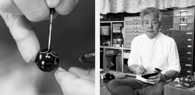 漆で仕上げた球に、虹色の光沢を放つ約0.7mmに裁断した螺鈿(貝殻の内側の真珠層)を1枚ずつ手張り。その数、亀甲は約140枚、七宝は約200枚。あまりに繊細な作業のためため1日1つ作るのがやっとの逸品です。