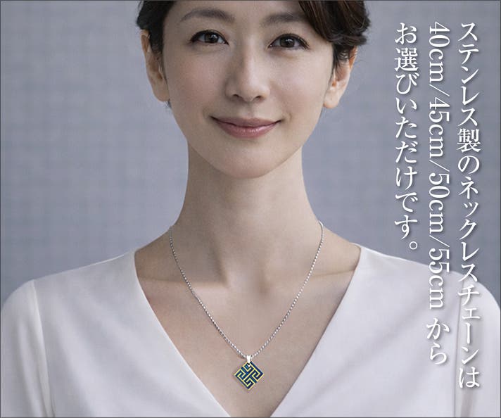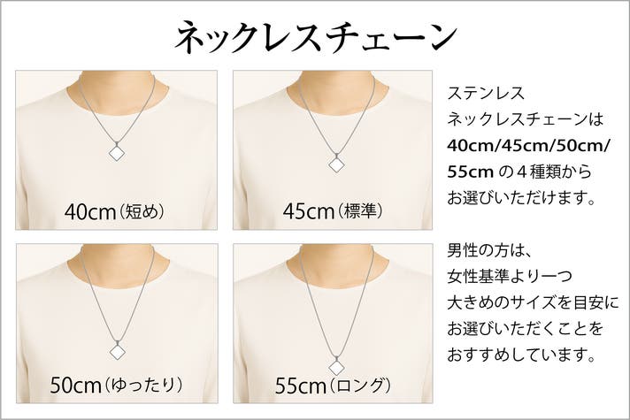 40cm・45cm・50cm・55cmの4サイズからお選びいただけます。装いに合わせてお好みの長さをお選びいただけるよう、日常使いしやすいサイズをご用意しました。素材には、汗や水にも強く耐久性に優れたステンレスチェーンを使用しています。