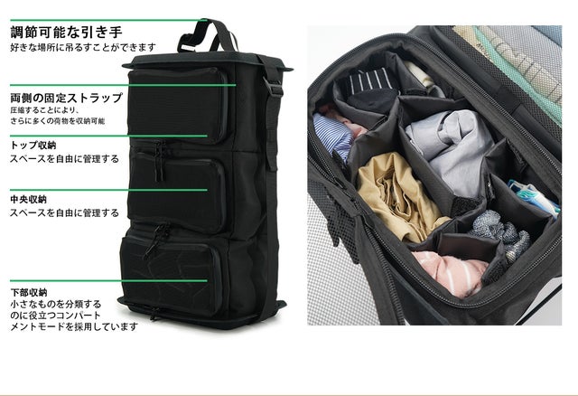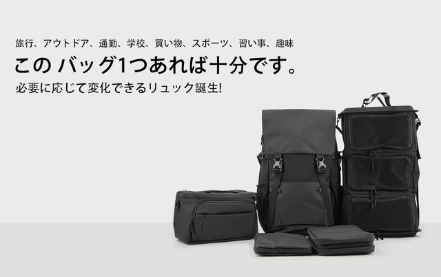 バックの中をクローゼットのように整理整頓&必要に応じて縮小可能&アウトドアでも通勤でも使える多様性を実現しました。