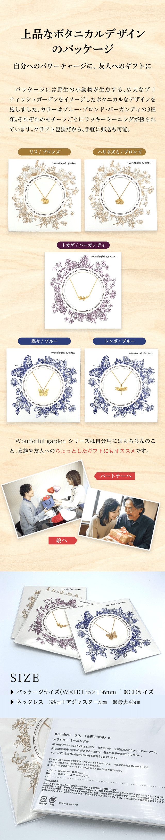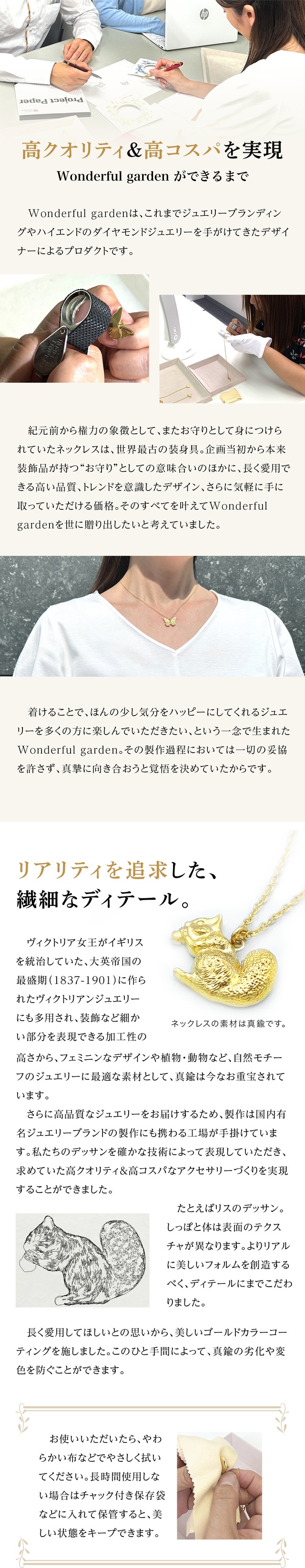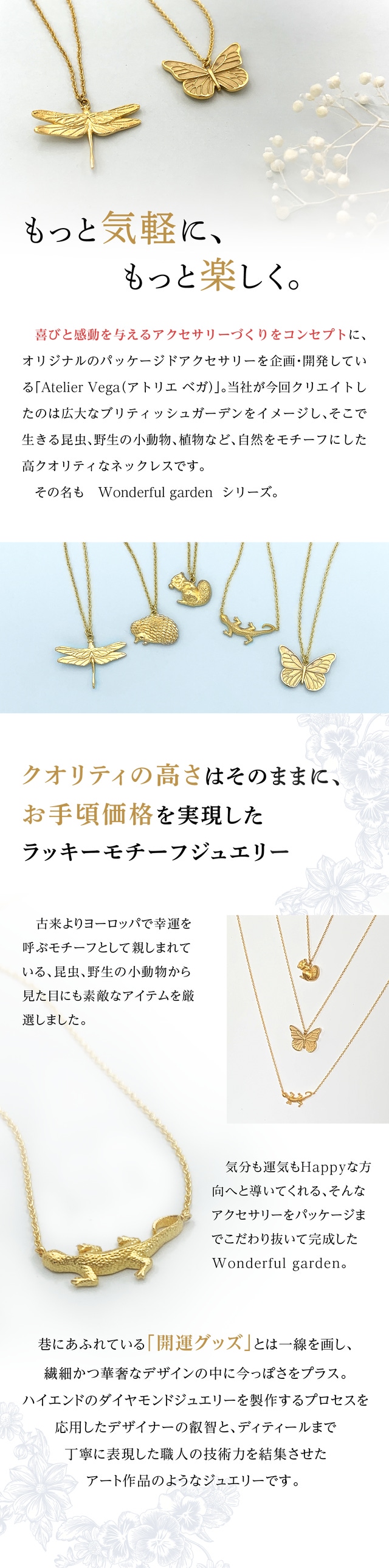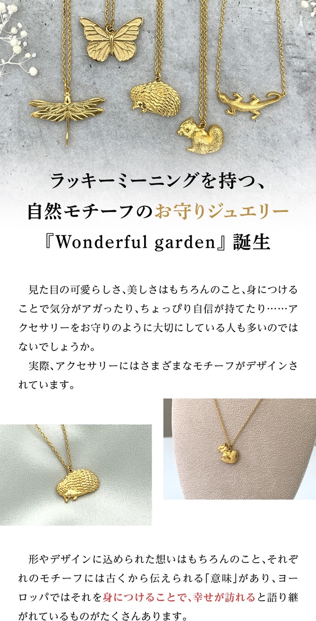 英国では、ラッキーモチーフのチャームを親しい人や家族にプレゼントする習慣があることや、幸運の言い伝えがある動物や植物のモチーフが多くあることを知り、ブリティッシュガーデンの中で生息する幸運の意味合いのある動物たちを、ラッキーミーニングと共に、自分へのご褒美、また、ちょっとした気の利いたギフトとして、パッケージと共に世界観を表現できたら、と想像が広がり、Wonderful garden が誕生しました。