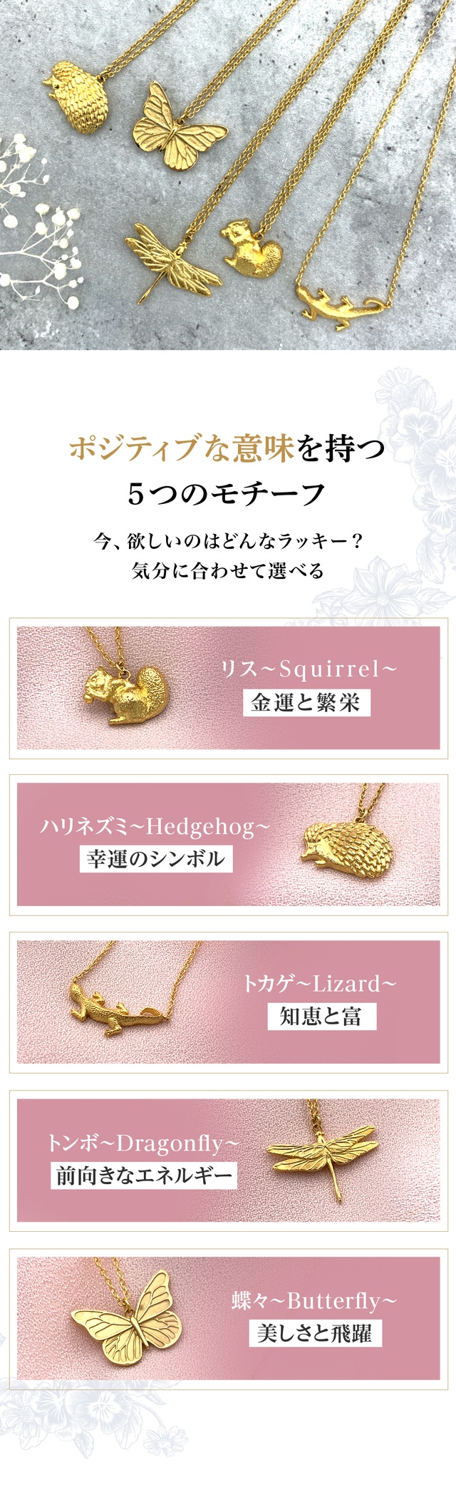 - 【5種類のラッキーミーニング】幸運のモチーフを身につけることで、気分も運気もアップ♪