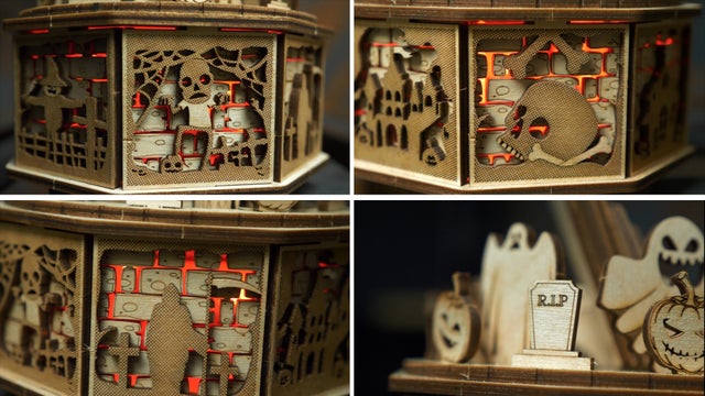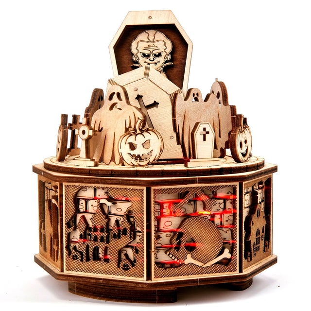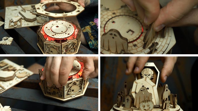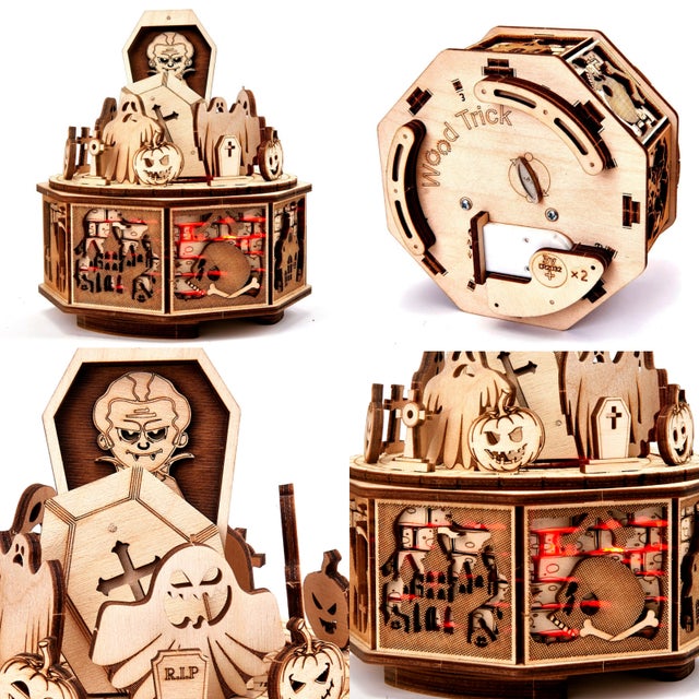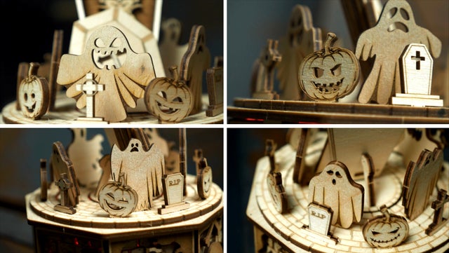 こうして出来上がったモデルは感動的です。可愛くコミカルなお化けたちの表情がくっきりと出て来るのと同時に、お化けたちのパーティという楽しい雰囲気の中にも、木の上品さと優雅さ、品質の高さが浮き彫りになってくるのです!加えて新モデルごとにクオリティを上げるウッドトリックの最新作ということもあり、ギミックの面白さもモデル中、随一と言えます!