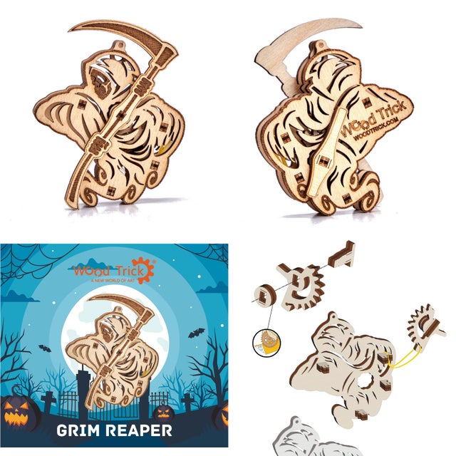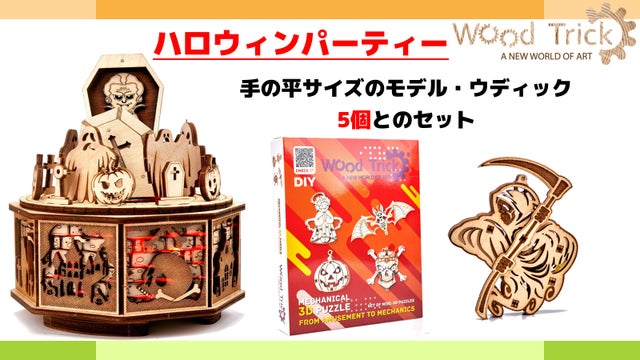 ハロウィンパーティと、ウッドトリックのミニモデル、ウディックセット(4個)と、こちらもウディックのひとつ、恐怖のグリムリーパーをセットで通常価格¥ 7,550 (税込)+送料¥900 = ¥8,450 を、早割で15%引きの¥7,190で販売致します!