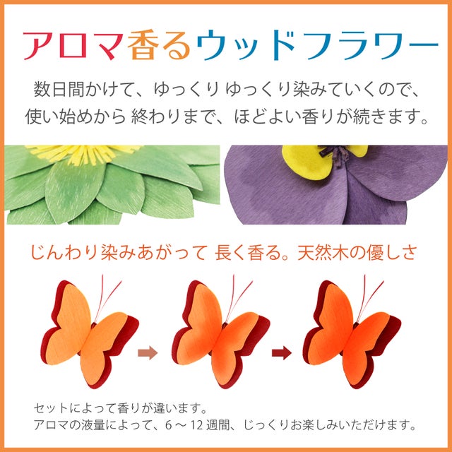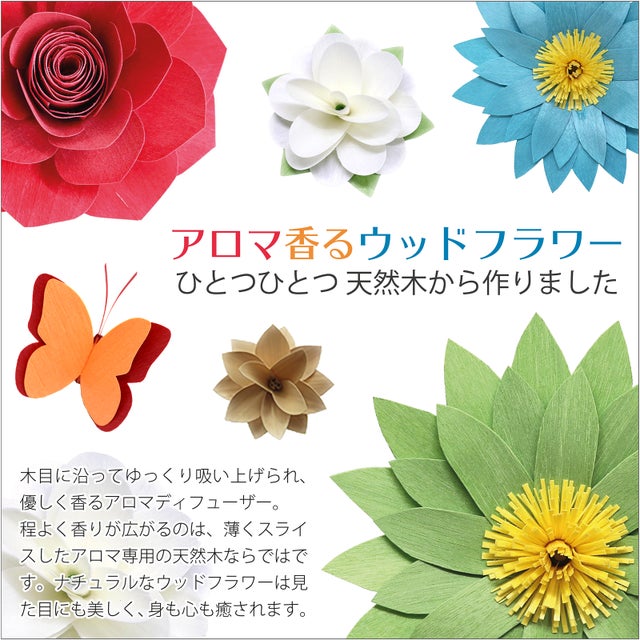 ウッドフラワーは、多くの花びらと茎でより優しく心地よい香りを発散します。花は香りをつけた後、 オイルが無くなってもしばらくは香りを保ち続けます。