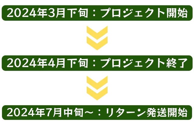 A :リターン内容によって異なり、『スタート割』『超早割』『2脚セット割』については2024年7月中旬頃を予定しており、それ以外のリターンについては8月上旬頃の発送を予定していますが、可能な限り前倒しでお届けできるよう進めてまいります。