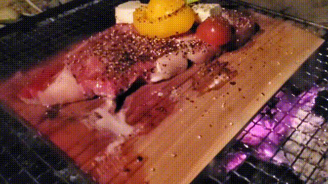あらかじめ水に浸したウッドプランク(=木の板)の上に食材を乗せ火にかけます。そうすることによって、蒸し焼きと燻しを合わせたようなしっとりと風味豊かな味に仕上がり、美味しさが格段に増します。