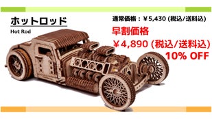 今回、販売させて頂く新商品は2つ、1つ目はクールなロードスター、ホットロッドです!ホットロッドは1930年代に生まれたカスタムカーのジャンルで、当時はスピードを追い求める若者達の熱狂の的でした。むき出しのV8エンジンを積みタイヤから白煙を巻き上げて猛速度で走るホットロッド、ウッドトリックのこのマシンにあなたも熱狂してみませんか?