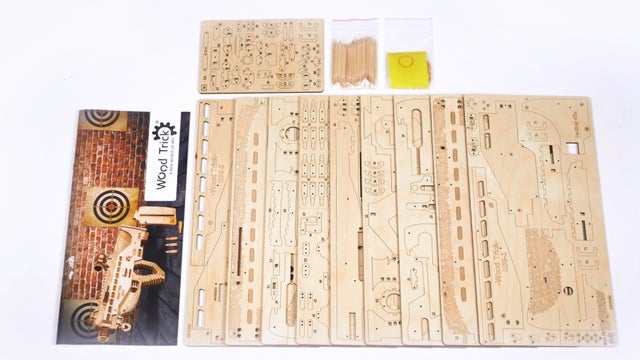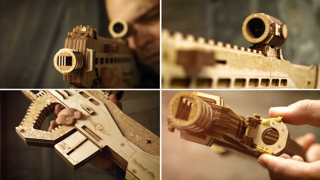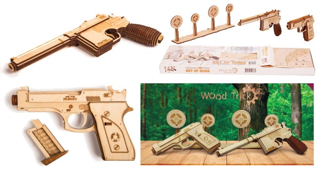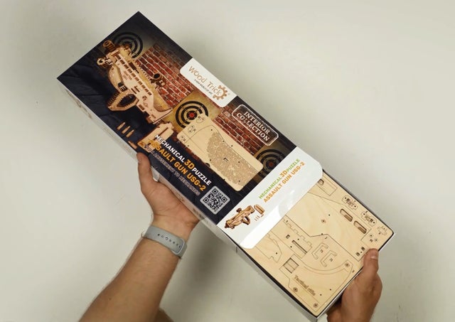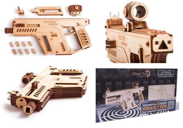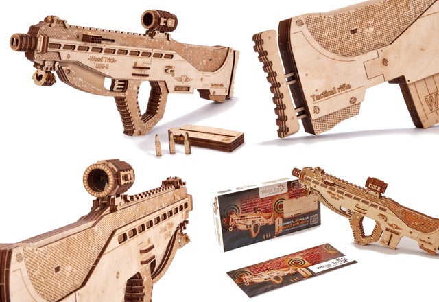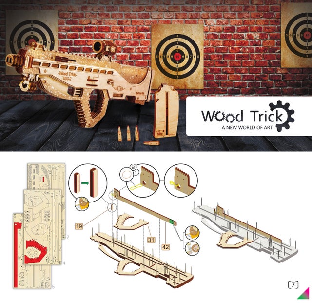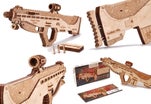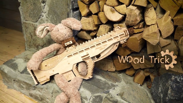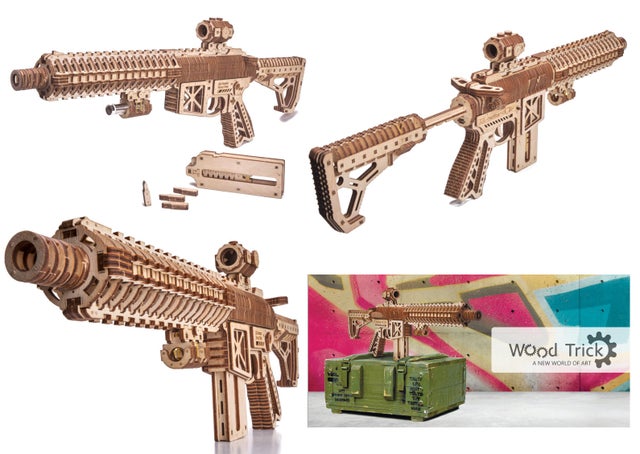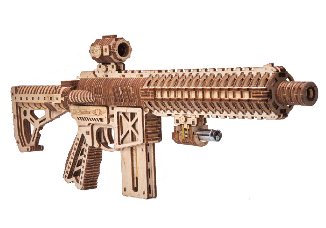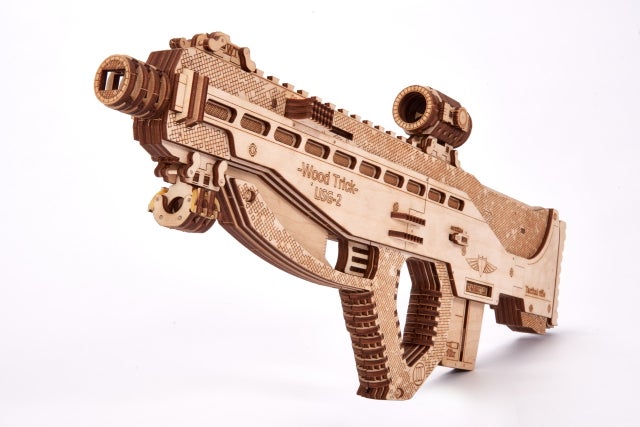 このUSG-2も木の弾をマガジンに入れてゴムの力で撃ち出す事が出来ますので、的を用意して射的ゲームをして遊んだりする事が出来ます。このようにウッドトリックの多くのモデルはゴムの力で弾を撃ち出したり、カーモデルなどはゴムの力で自走させたり、オルゴールが付いていたり実際に動く時計のモジュールが付いていて置時計や掛け時計になったりと、組み立てを楽しむだけでなく、組み立てた後も遊べたり実用的に使ったりする事が出来るのです。