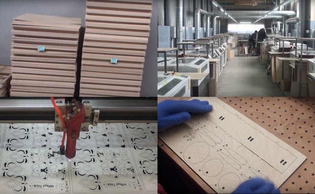 木材版をレーザー加工機にセットして部品を作っていきます。出来た部品の板は人の手で一枚ずつ丁寧にやすりで拭かれます。