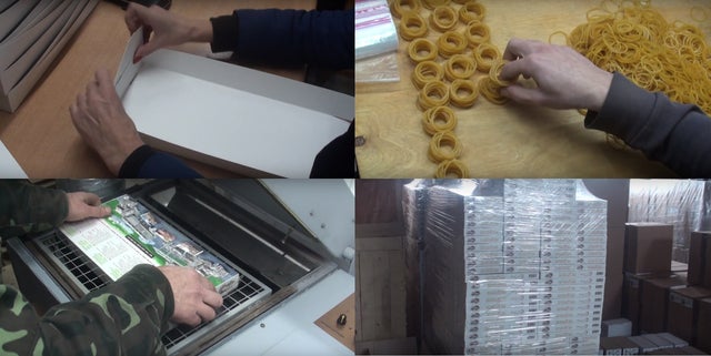 パッケージも工場内で制作。折りたたんで商品を中に入れます。模型に使われるゴム。このゴムの動力で模型が動くようになります。箱に包まれた商品は輸送中に傷つかないようにラップで厳重に包みます。一度ウッドトリックの商品を手に取って頂けばきっとわかって頂けますが、一つ一つの商品の外装のラップから化粧箱、パーツの木の板、説明書まで全てが高品質です。各製造段階で非常に注意を払って製造されているのが良くわかります。