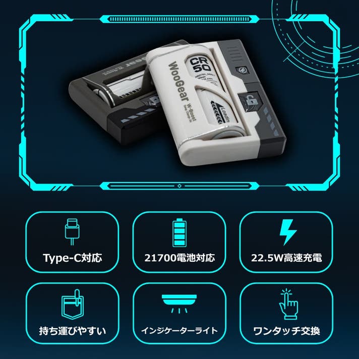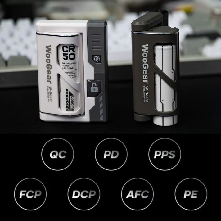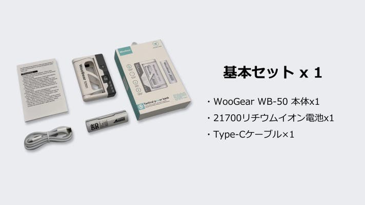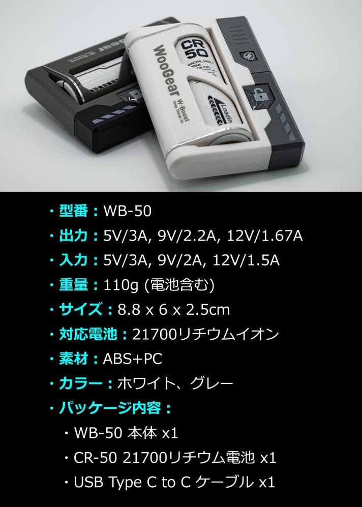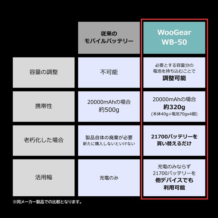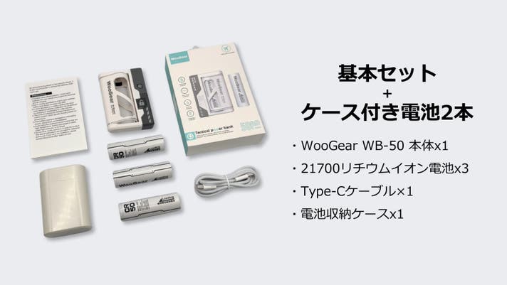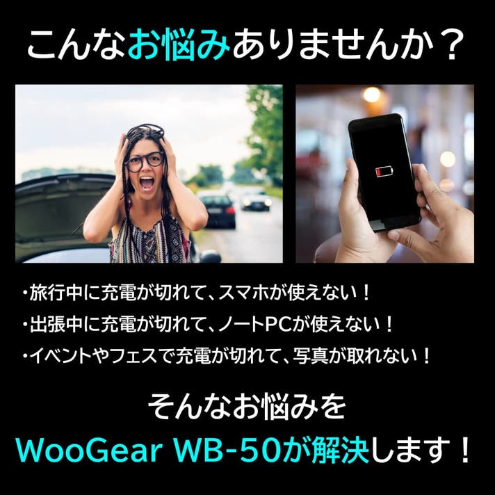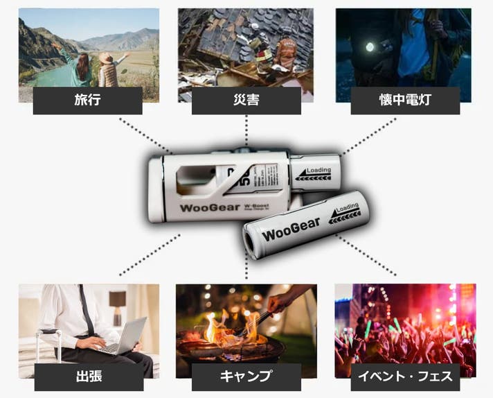 WooGear WB-50は、旅行や出張、キャンプ、イベントやフェスへの参加などの野外活動でありがちな「モバイルバッテリーの充電が切れてしまった」、そのような困った場面でも電池を交換するだけで"終わり"なく充電し続けることができるように設計した「電池交換式モバイルバッテリー」となります。