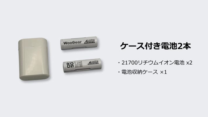 懐中電灯などに使われる市販の21700リチウムイオン電池(フラットトップ)に対応しています。これにより、緊急時の電源補充や日常使いの利便性が格段に向上させています。