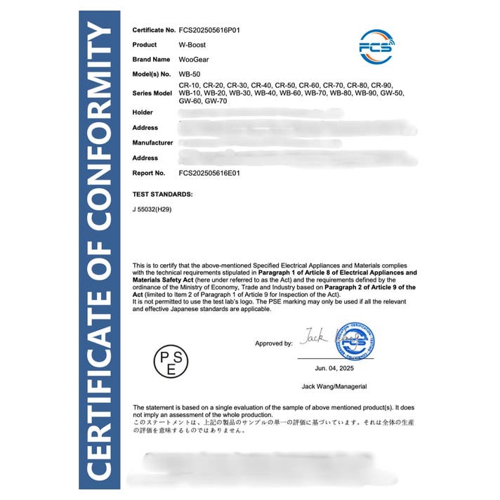 日本のPSE(電気用品安全法)を含め、CE認証とFCC認証、ROHS認証などの国際認証も取得済みです。