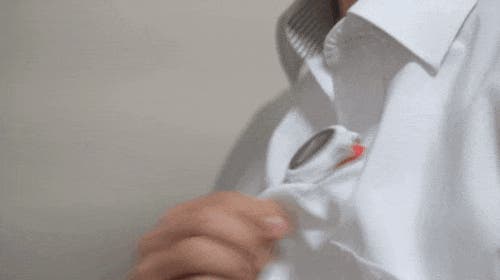 胸の高さに着用しても頭を下げると確認することができます。服への装着型時計を使った経験がない方は胸の高さへの着用に慣れない可能性があるため、見やすい快適な視野の範囲でご着用ください。