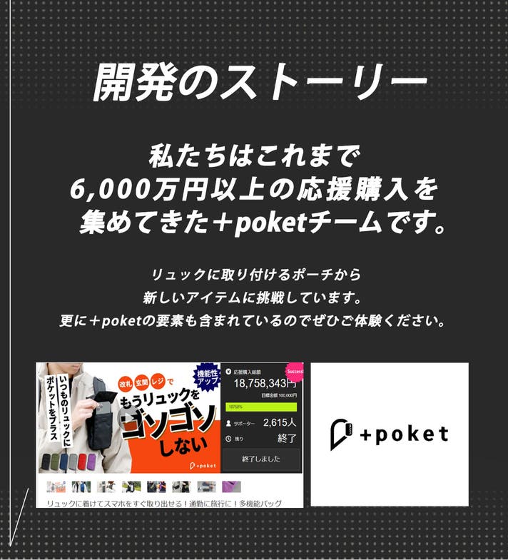 前回の【+poket】はとても大きな反響があり、最終的に海外での販売にもつながりサクセスすることができました。、応援購入総額は1,800万円を突破することができました。