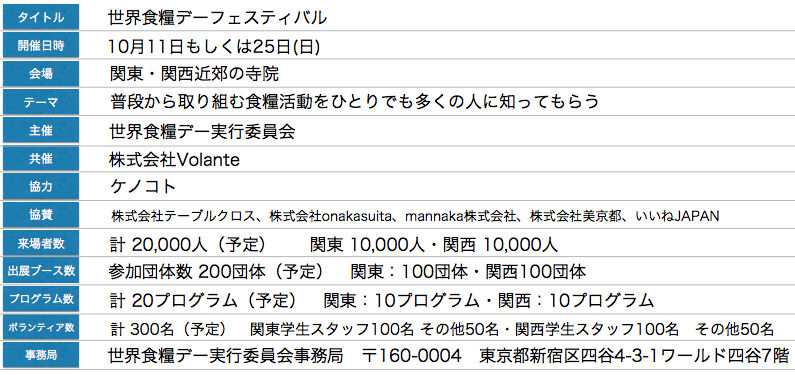 私たち「世界食糧デー実行委員会」は、世界における日本の食糧問題を多くの方に知っていただくこと、そして食糧問題に対しての取組みを行っている組織が集まり“コミュニティ”を広げることを目的とし、このフェスティバルを開催いたします。