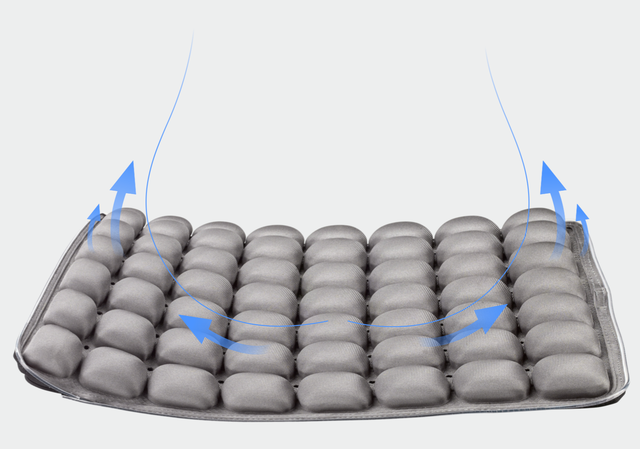 内部の空気は周囲のエアバッグに流れ、空気圧を上昇させ、座った部分の圧力を軽減し、あなたにフィットするヒップ形状を作ります。また、クッション表面の弾力性のある立体的なエアバッグはマッサージされているような感覚でリラックスをもたらしてくれます。