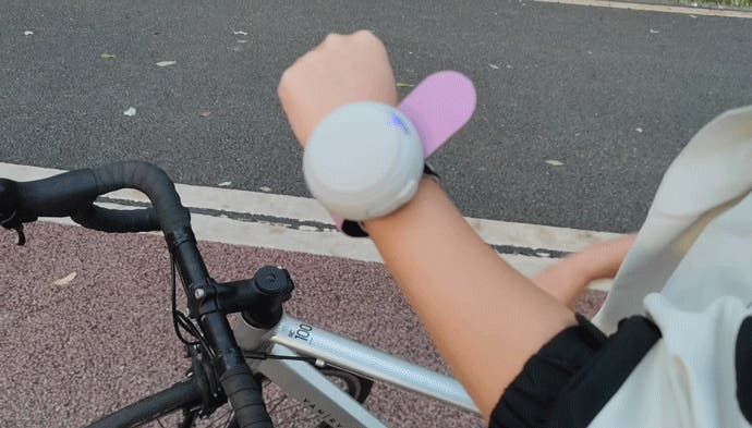 付属のアタッチメントで、自転車のハンドル部分はもちろん、腕やバッグなどさまざまな場所に自由に装着可能。