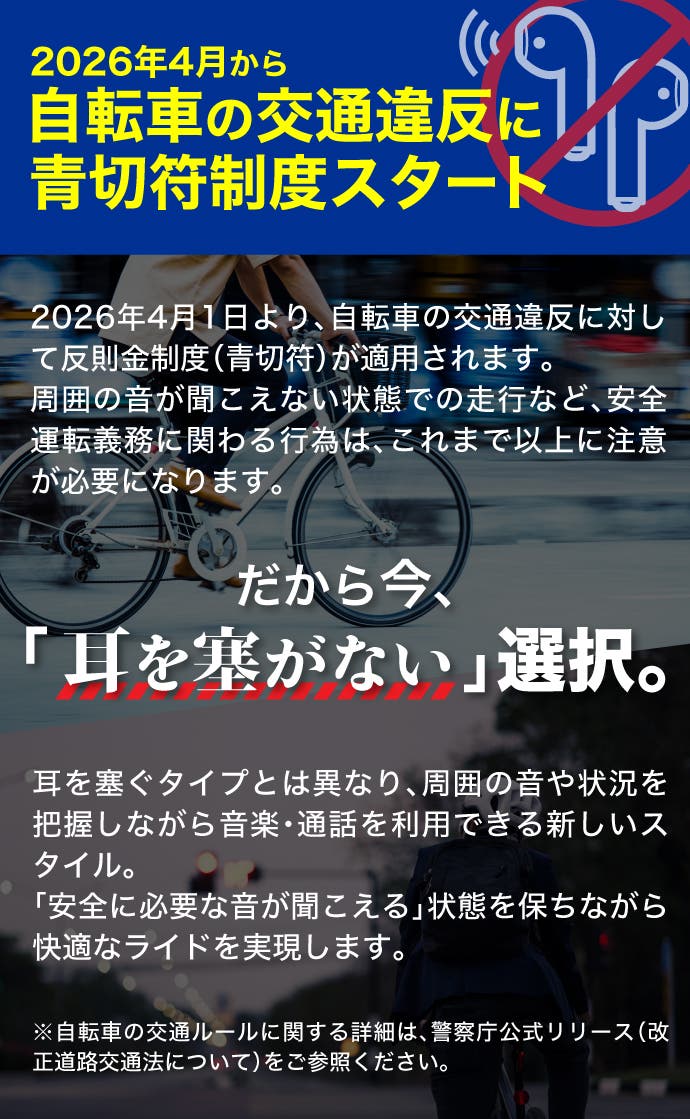 ※本製品は耳を塞がない構造ですが、大音量での使用等により周囲の音が聞こえない状態で走行した場合は、各自治体の条例や道路交通法に抵触する恐れがあります。常に適切な音量でご使用ください。