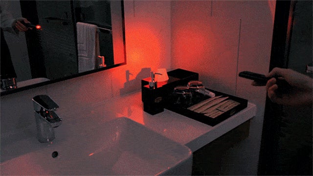 カメラのレンズはガラス製のため、WT16から発射する赤い光(可視光線)がカメラ側のレンズに照射されれば、光が反射し目視で発見できます。この方法で、有線カメラ・ワイヤレスカメラはもちろん、電源を切ったカメラも簡単に発見することができます。