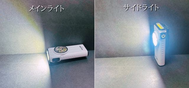 メインライトはCOBライトで周囲を均等に広角に照らします。足元や手元をムラなく照らすのに最適。