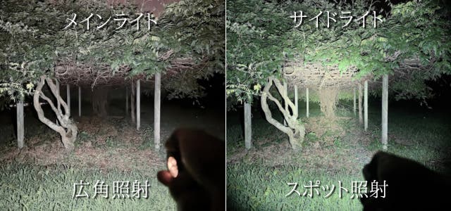 前面はCOB広角ライト、側面は3灯式LED広角スポットライトで手元や周囲を明るく。1台で使い分けできる2光源(デュアルライト)搭載。