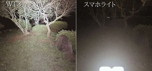 スマホのライトは手元を照らす程度。WT3は遠くまでクリアに照射します。
