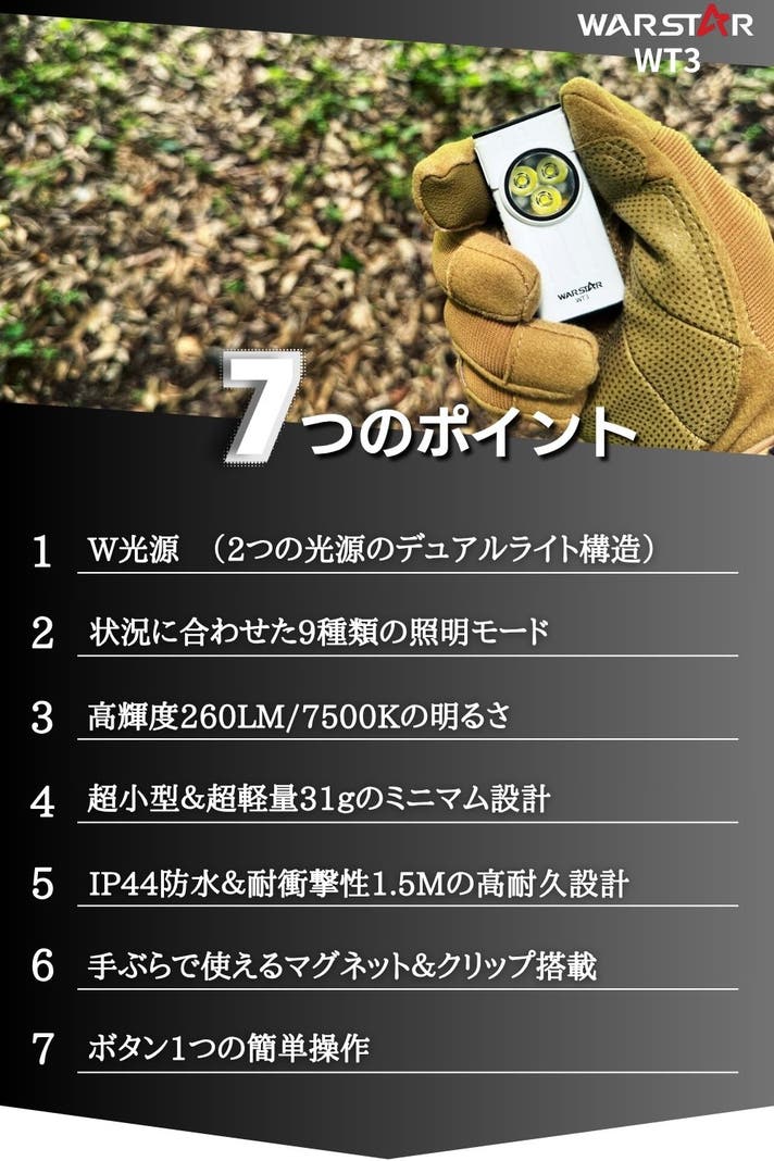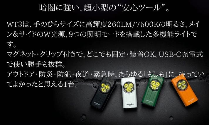 今回ご紹介する「WT3 高性能デュアル懐中電灯」は、カギより小さい超コンパクトボディに、W光源・高輝度7500K・防水・多機能を搭載した、日常から緊急時まで活躍する“頼れる相棒”です。