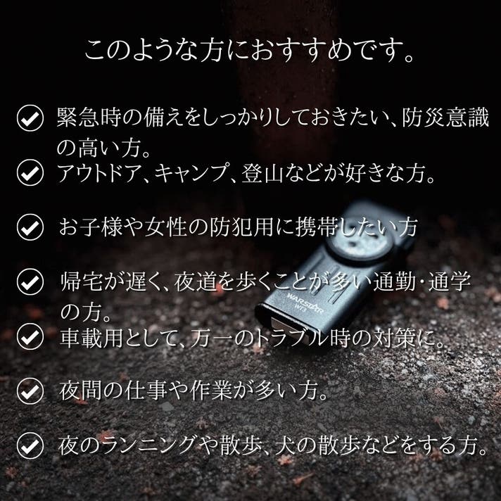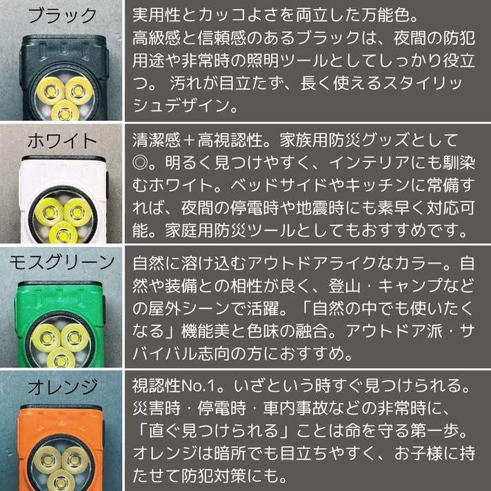 キャンプ・アウトドア・災害時・緊急時・防犯・夜の散歩・ペットの散歩・夜間の作業など日常のあらゆる場面で活躍します。