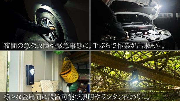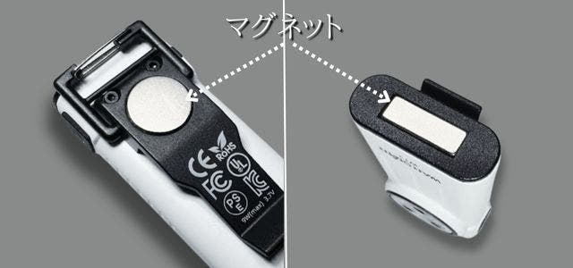 背面とテール部にマグネット搭載。金属面にピタッと設置できる。Wマグネット構造のため様々な状況に対応。夜間の作業や緊急時に役立ちます。