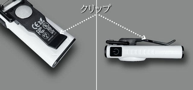背面にクリップ搭載。帽子のツバ、バック、ジーンズのポケットに挟めるクリップ付きで使い方も無限大。