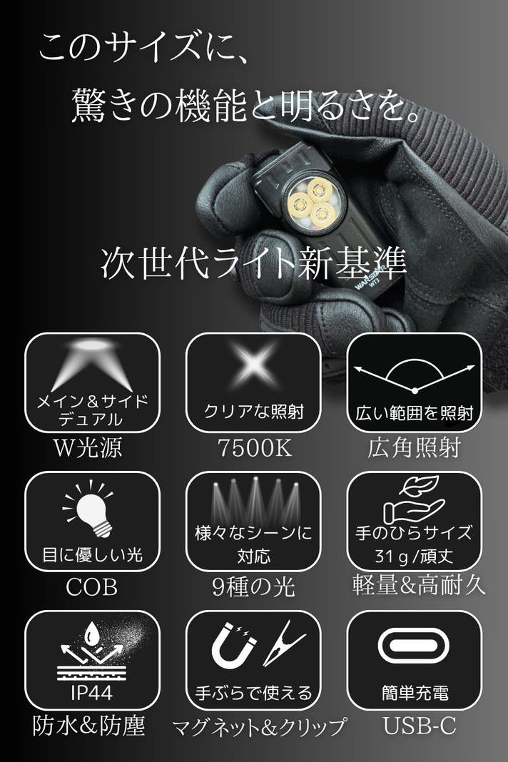 - 【W光源×9モード照射】前面と側面のWライト,超広角7500K、状況に合わせた照射で大活躍。