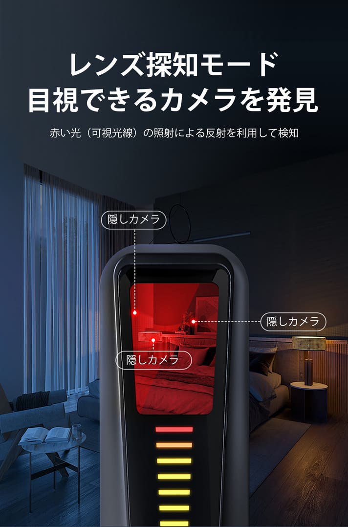 本製品は暗視機能付きカメラが発する赤外線を検知し、暗所やぬいぐるみ、インテリアに隠されたカメラも効果的に見つけ出します。