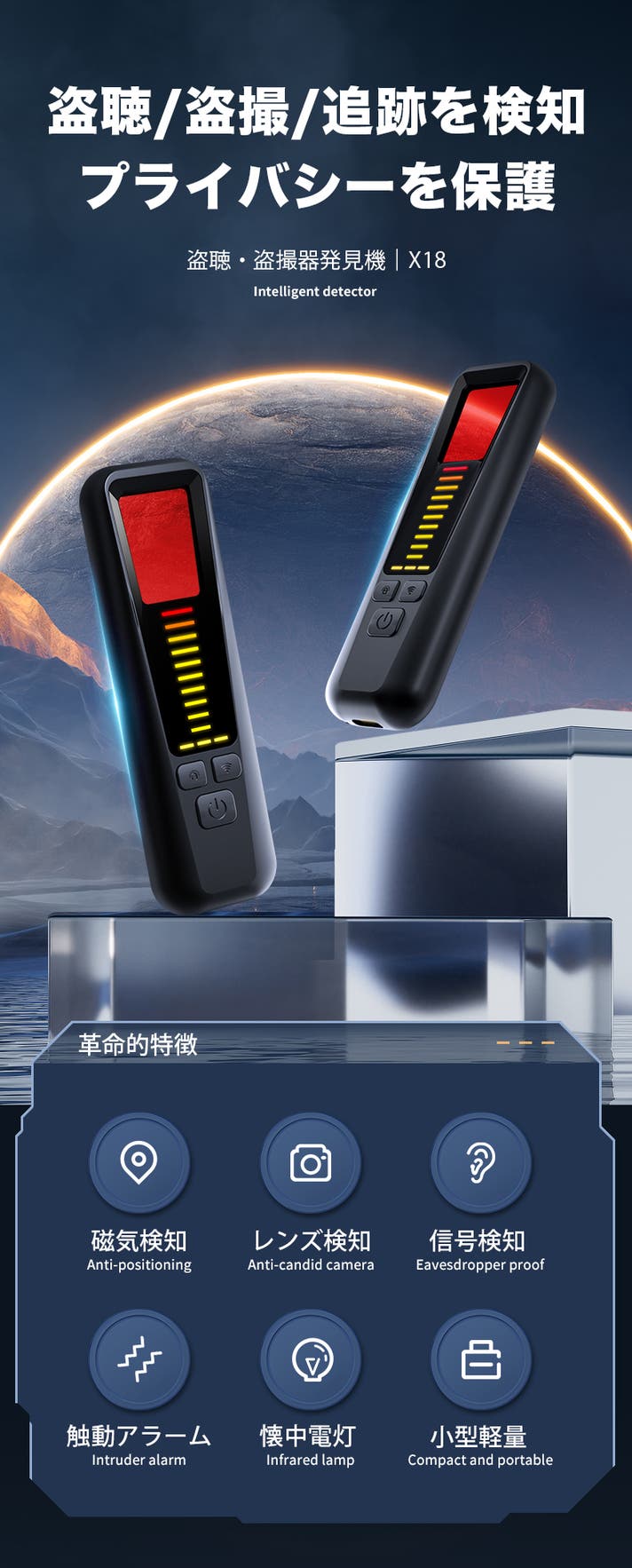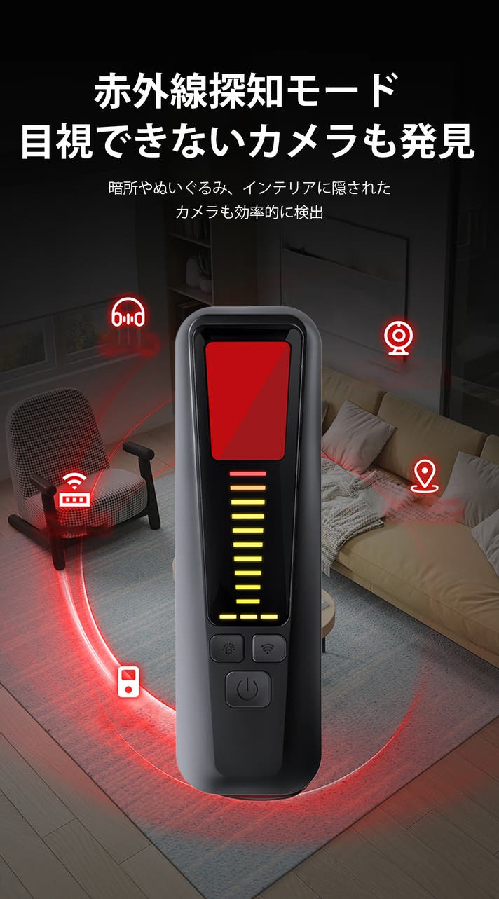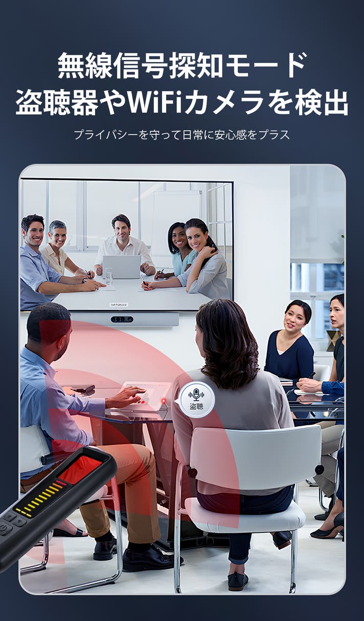 本製品は無線信号探知モードを搭載し、盗聴器やワイヤレスカメラなどの不審な無線デバイスを高感度で検知できるため、プライバシーを守りながら日常に安心感をプラスします。