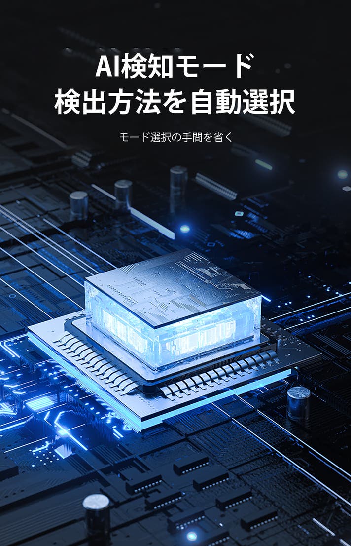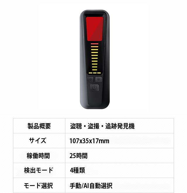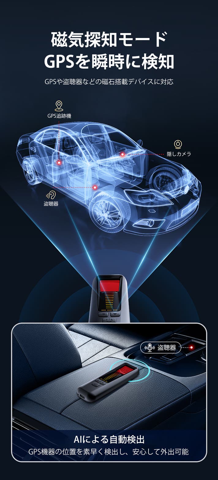 本製品はAI自動探知モードを搭載しており、ボタンを押すだけでAIが最適なモードを自動で選択し、隠しカメラや盗聴器、GPS追跡装置などを検知します。