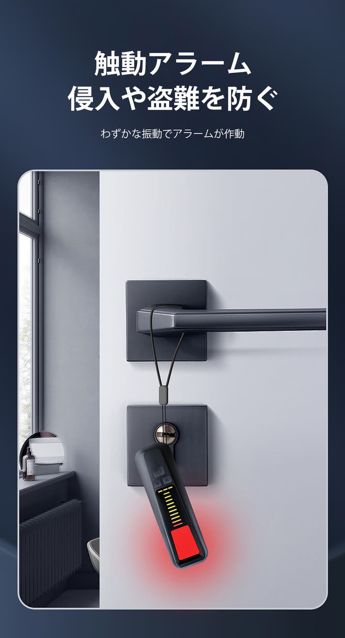本製品は触動アラーム機能を備えており、ドアノブや窓に掛けるだけで振動を感知し、瞬時にアラームを発して異変を知らせます。