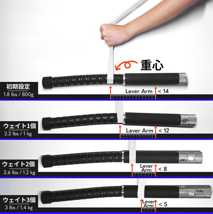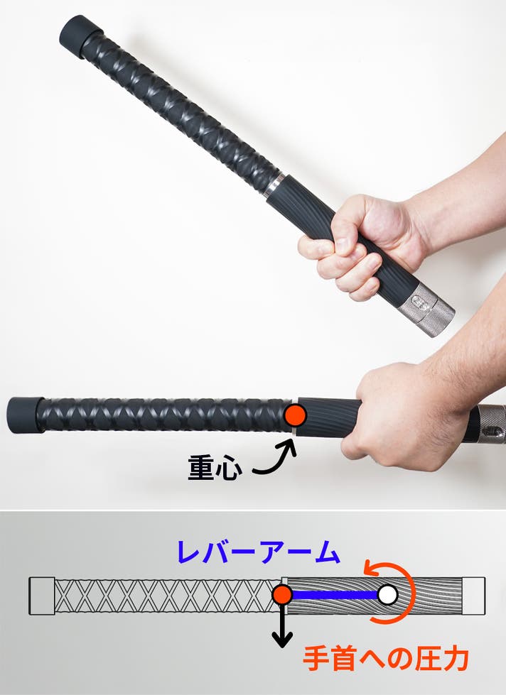 ウェイトをグリップ側の根元に配置することで、レバーアーム(支点から力点までの距離)が短くなるよう設計されています。