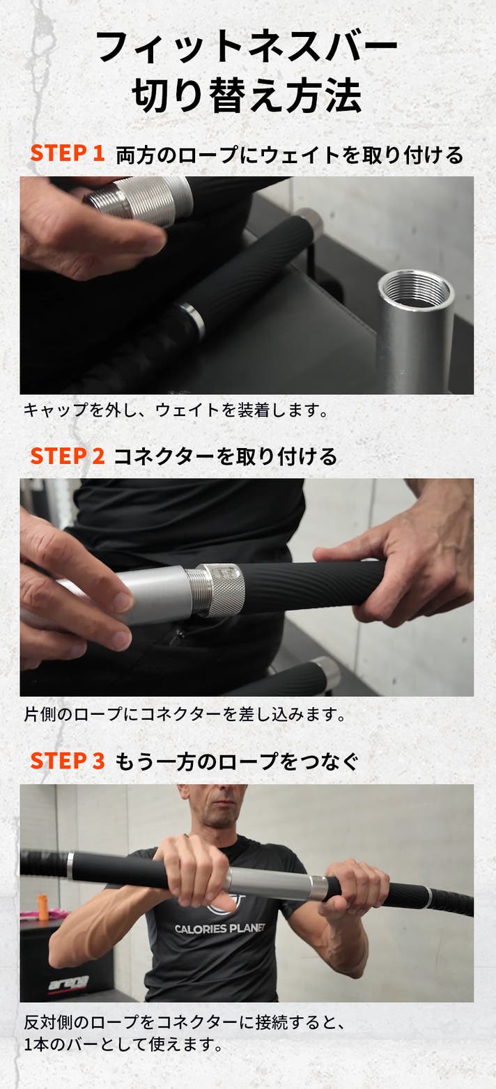 - 【変形バー】2本のバーを1本に組み立てられる構造。フィットネスバーとしてのトレーニングにも対応