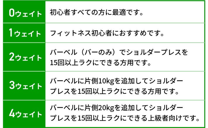バー1本に対してのウェイト数の推奨は以下の通りです。