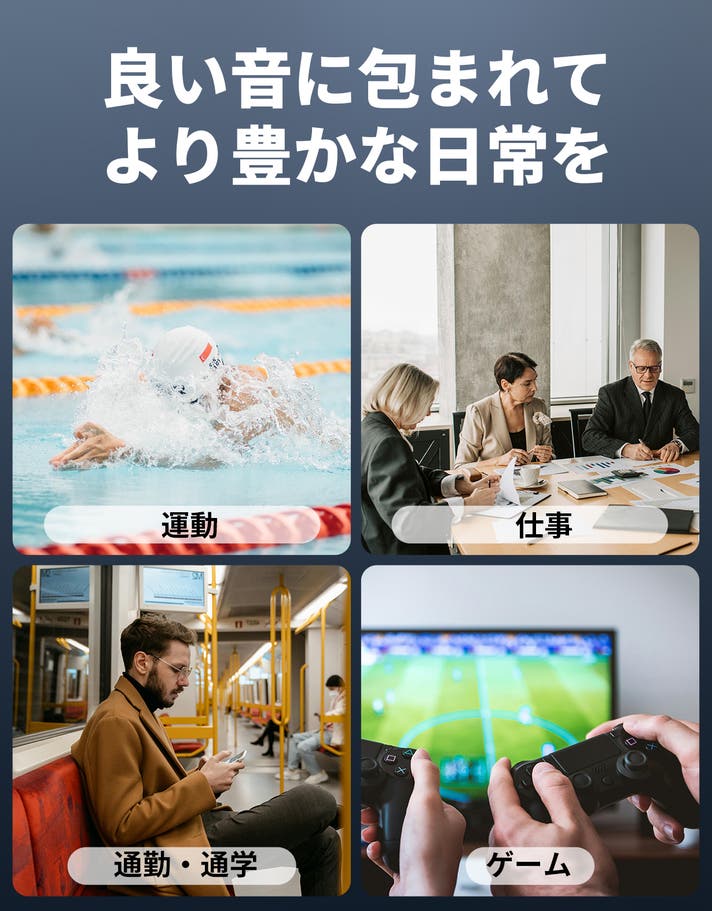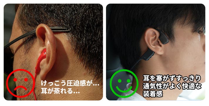 ・スポーツ時: 汗や雨を一切気にせず、周囲の音も聞こえるので安全に。