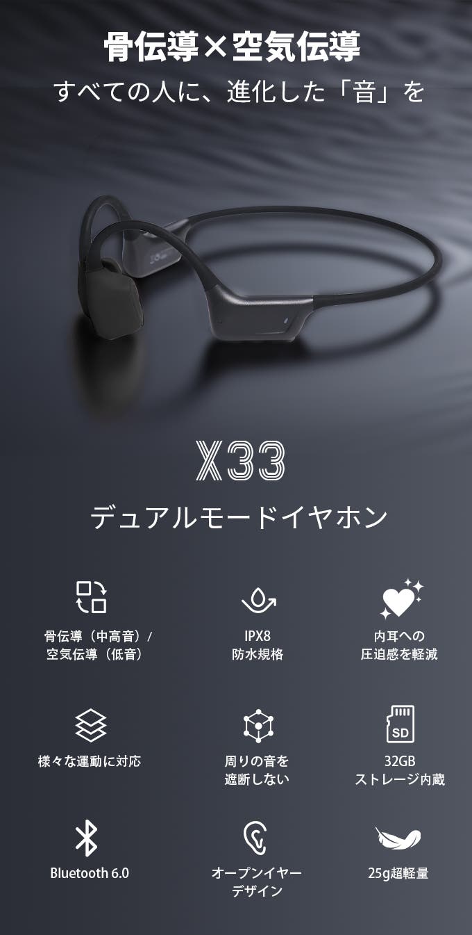 IPX8防水の骨伝導×空気伝導 デュアルドライバーイヤホン「X33」。