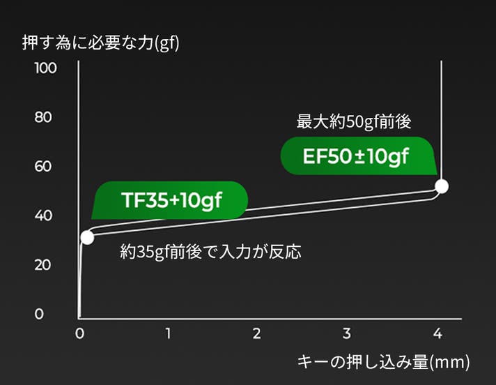 初動は約35gf。軽い力で素早く反応します。そして底打ち時は約50gf。